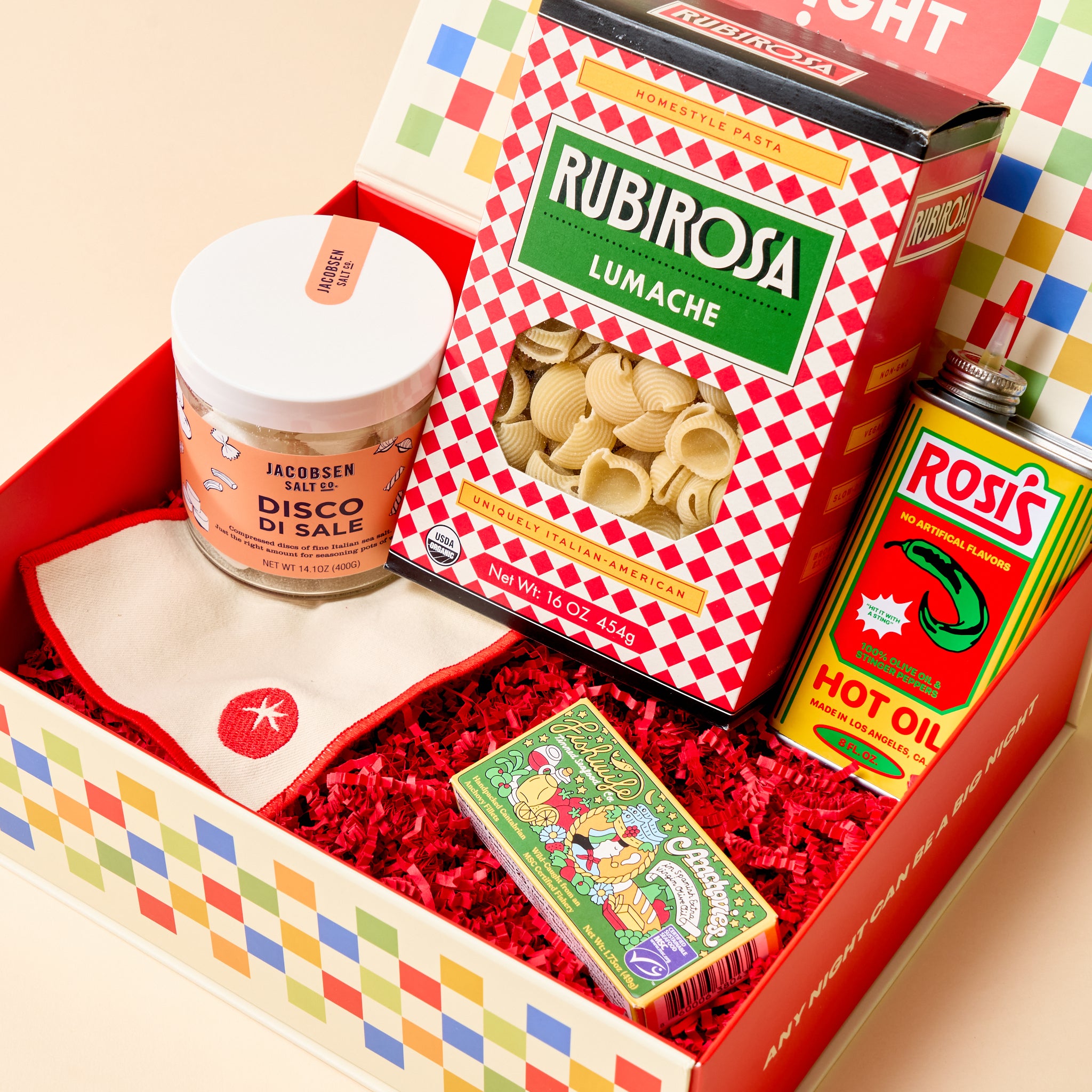 Every year, we hand-select our favorite items for our signature lineup of Big Night Boxes: already wrapped in the most festive box, all you need to do is pop a bow on and it's ready to gift.