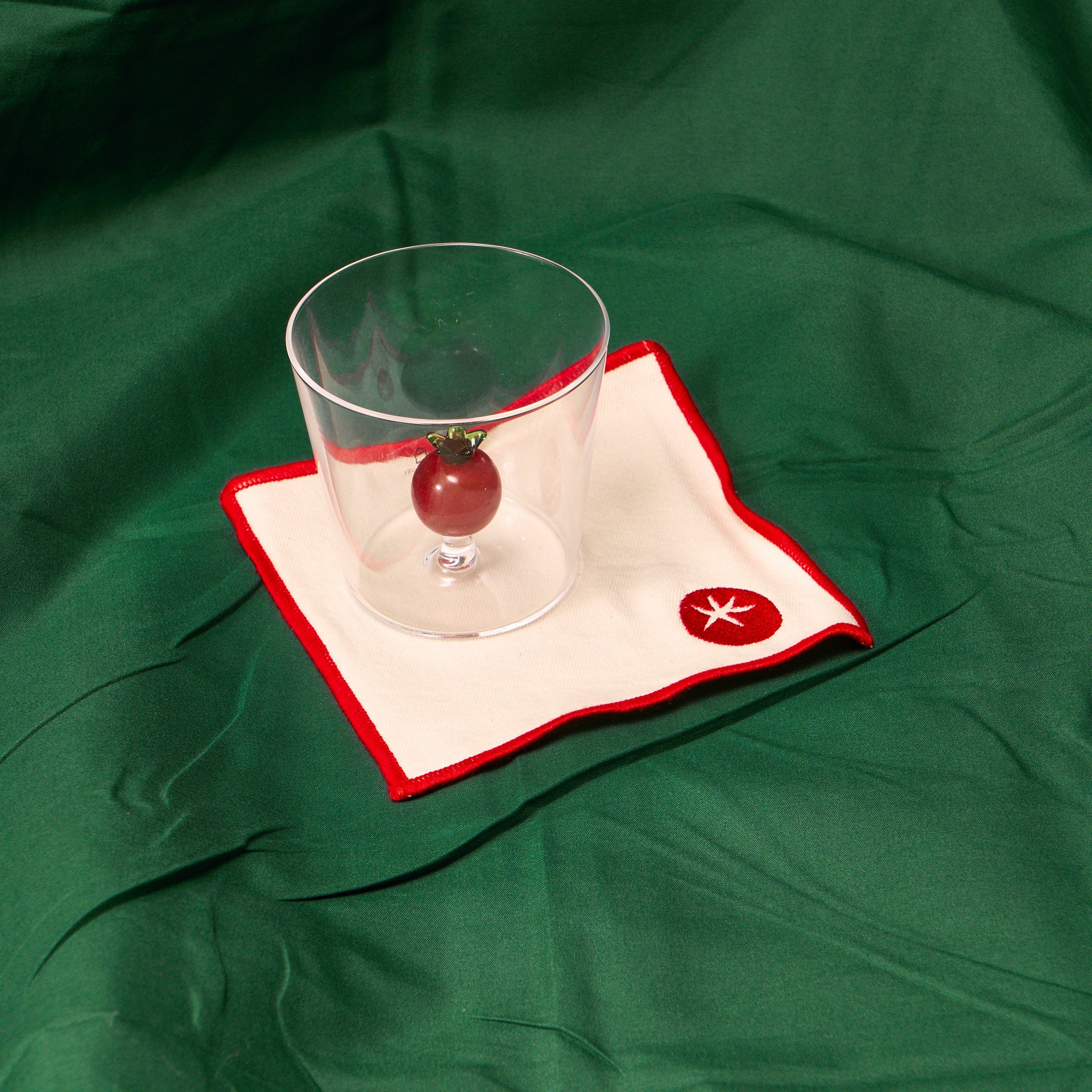 The perfect aperitivo setup for the ultimate tomato girl: four Ichendorf Milano Tomato Tumblers, plus a set of four Embroidered Tomato Cocktail Napkins.