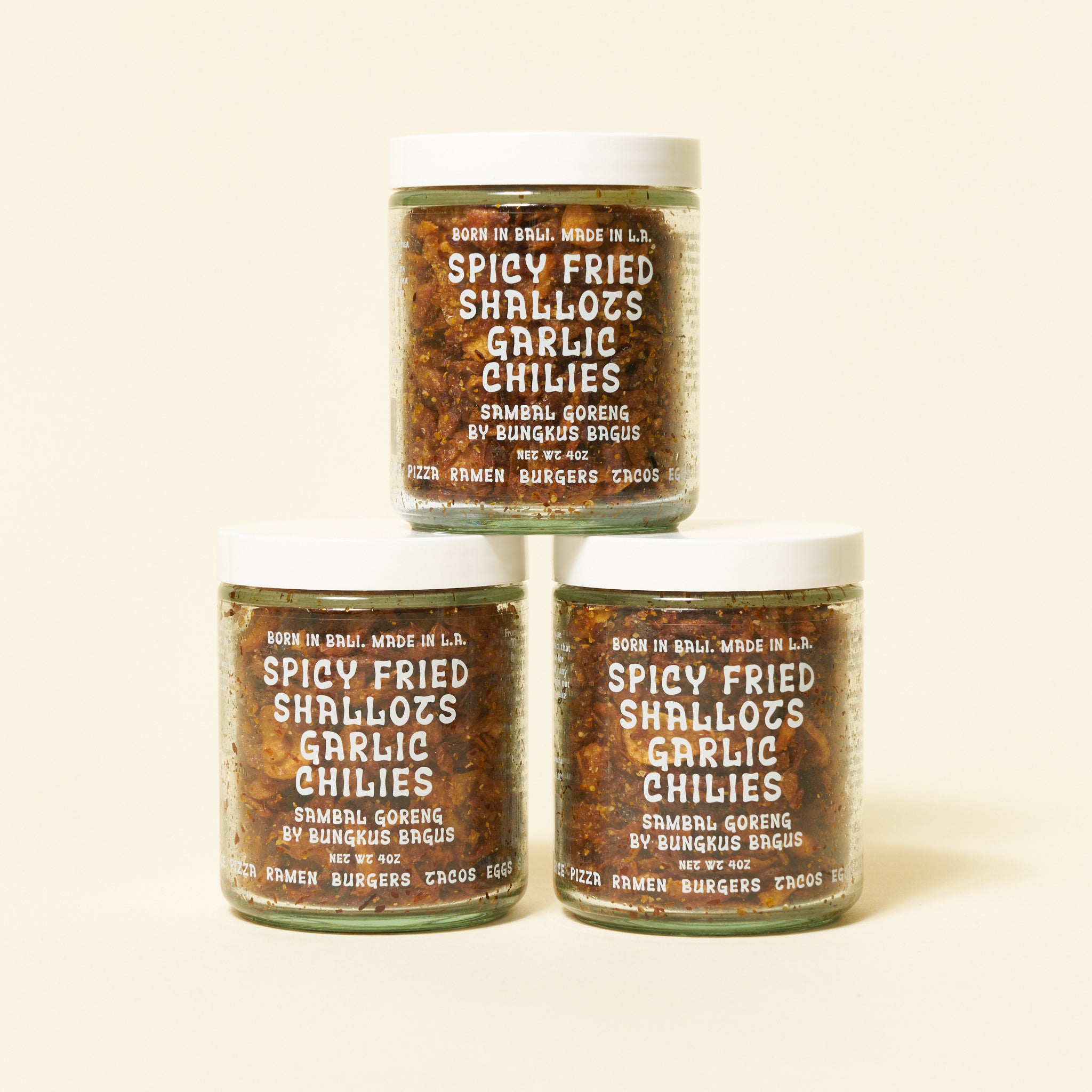 One for you, one for someone you love, and another one for you. This is a trio of Bungkus Bagus' Spicy Fried Shallots, Garlic, and Chilies, one of our bestselling Big Night condiments of all time.