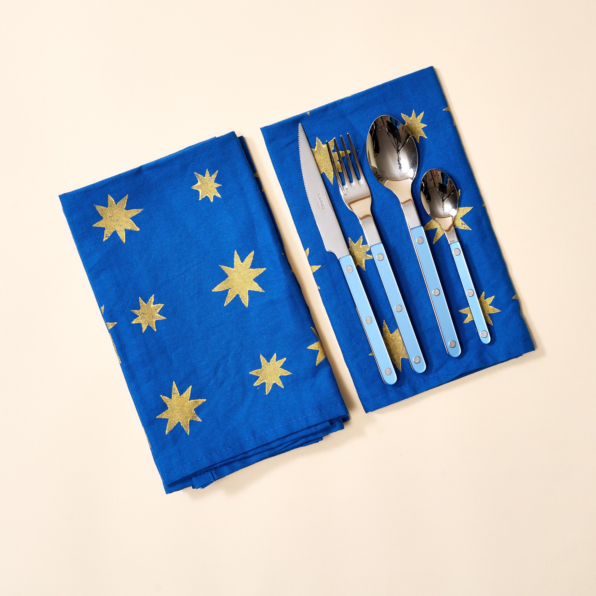 Oversized cotton-linen dinner napkins with hand-carved, block printed stars for every festive holiday gathering.